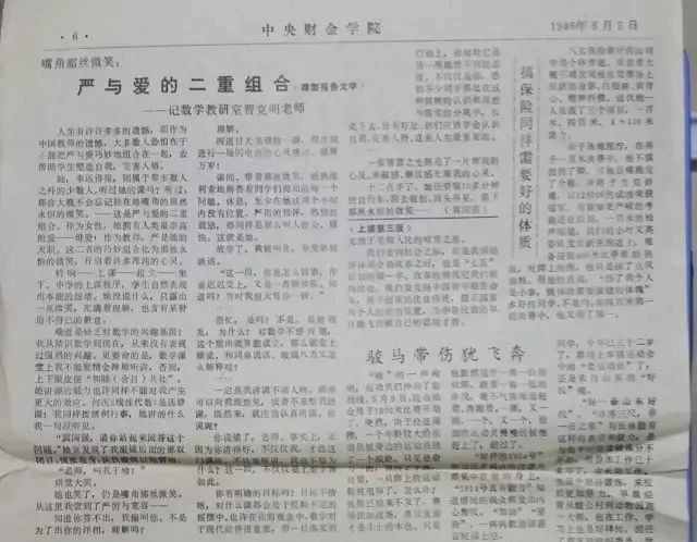 当年,黄宇光老师让我负责运动会(院报1986年6月5日第六版)的编辑和校对,这版报纸上刊登了我的其他文章——《全能姑娘孙振萍》和照片,在这一版我就用笔名“杨杨”或“本报通讯员”发表了照片《征服新的高度》、《搞保险同样需要好的体质》;此外,八四财政冀国强的报告文学《严与爱的二重组合》描述了我们的高等数学老师曹克明,让人印象最深。