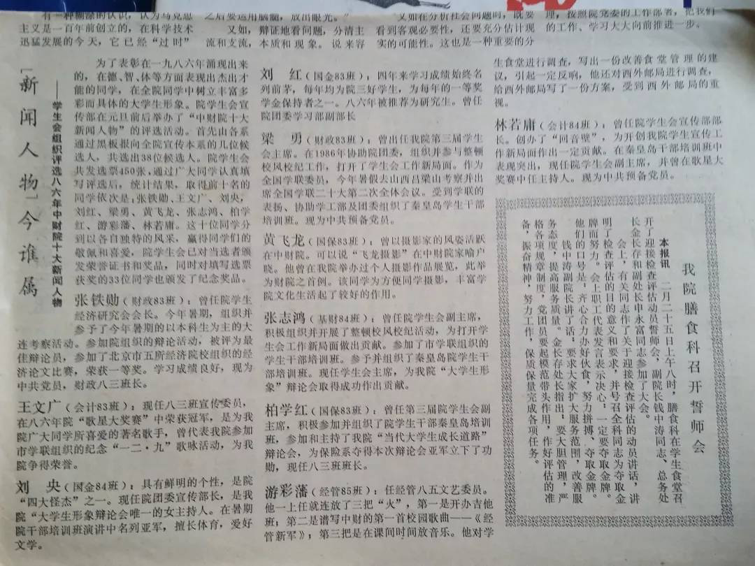 因业余时间长期在院报编辑室做校对工作,黄宇光老师便在他闲暇时教会了我摄影和冲洗黑白照片的技巧。此后我经常为同学们照相洗相片。大学时代的青春里,每个人都有不同的快乐回忆,虽然这些珍贵的回忆难以用手抓住,用心记住,但是我可以通过镜头记录下这些形象,让青春得以保存下来,让美好得以记忆下来。从1983年至1987年,一张张年轻、真诚、单纯、青春洋溢的脸庞,面对我的镜头,动作自然、笑容甜蜜,多少画面就有多少回忆,多少照片就有多少感染。学校操场里的每一条小树,都陪伴着我们的成长,校园的每一个角落都让我们深深地留恋,我镜头下的每一幅画面,都留下我们珍贵的倩影、青春的笑容,即使是同学们在操场上阳光照耀下的影子,也成了他们青春的回忆。在1986年末的中财院十大新闻人物评选时,几百位同学都投了有我名字的选票,据学生会当时的副主席柏学红(原我们国保83班头)透露给我,我的票数最多。那年幸运地与财院杰出人物张铁勋(财政83班)、王文广(会计83班)、刘央(国金84班)、刘红(国金83班)、梁勇(财政83班)、张志鸿(基财84班)、柏学红(国保83班)、游彩藩(经管85班)和林若庸(会计84班)成为中财院“十大新闻人物”之一。学生会和团委的评价是:《飞龙摄影》,在中财大家喻户晓,为方便同学摄影,丰富学院文化生活起到了较好的作用。