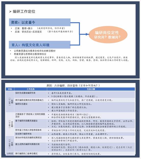 会上,档案编研科科长王卉乔做了《高校档案编研经验分享、借鉴与展望》的主题报告。首先,王卉乔介绍了我馆编研工作开展的现状与既有的编研成果,以及清华大学、对外经贸大学、上海财经大学、四川大学4所高校档案编研工作的特色和经验。接着,通过与4个兄弟高校的对标对表,找出目前我馆工作的不足之处,并进行原因分析。最后,根据习近平总书记关于“档案工作是一项非常重要的工作,经验得以总结,规律得以认识,历史得以延续,各项事业得以发展,都离不开档案”的重要指示,以及为学校“资政育人”服务的编研工作定位,本着挖掘档案价值、传播中财大文化、为学校教育教学事业发展服务的目的,从编研内容规划、编研机制设计、馆藏资源建设、编研队伍构建、成果宣传推广等方面,分步骤、分阶段展示了面向建校80周年的编研工作规划,提出了未来十年的10大项工作任务以及相对应的17项措施,勾画了档案编研工作的初步框架。