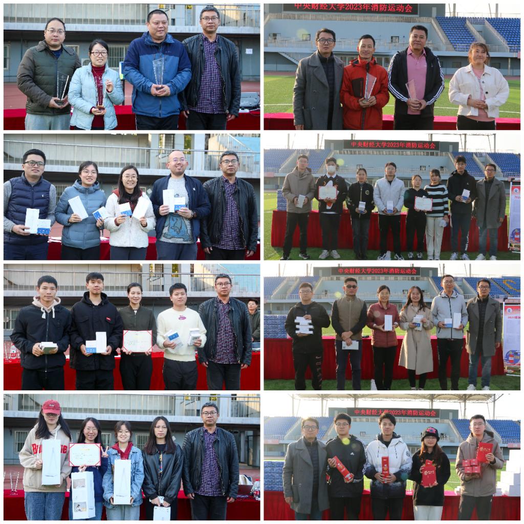 比赛结束后,工作人员分别为教工组、学生组的三人接力灭火计时赛和四人消防水带接龙赛项目前三名的队伍进行了颁奖。同时,根据各单位报名参与和现场组织情况,财政税务学院、信息学院、北京学院、商学院、财经研究院、校医院获得了本届消防运动会优秀组织奖。