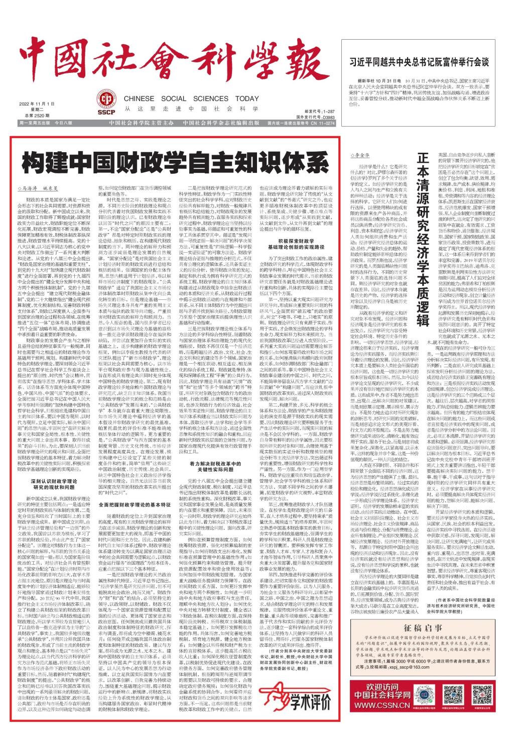 11月1日,由中央财经大学党委副书记、副校长马海涛教授,中国财政发展协同创新中心副主任姚东旻教授共同撰写的文章《构建中国财政学自主知识体系》在《中国社会科学报》2022年11月1日头版头条刊发。全文如下: