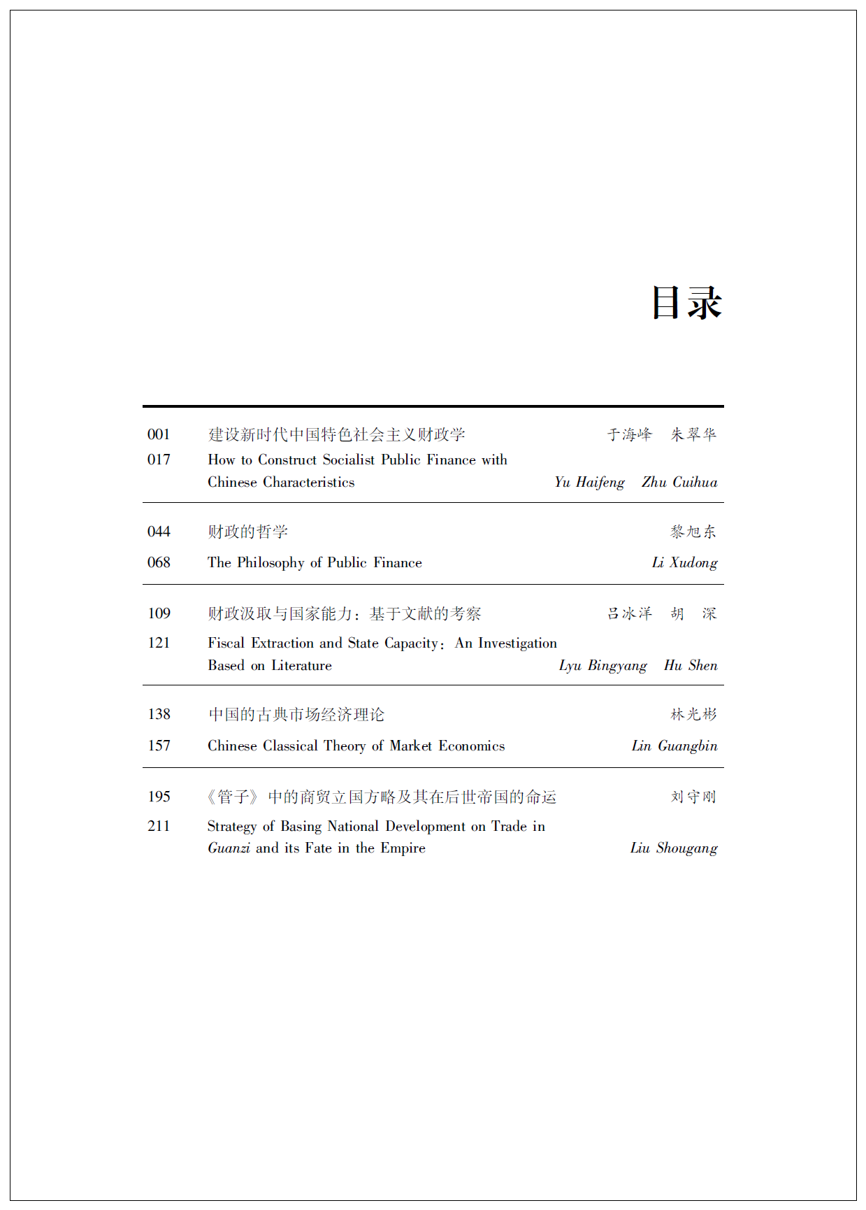 《新市场财政学研究》【中英文双语】2022年第1辑共收录5篇文章。于海峰和朱翠华撰写的《建设新时代中国特色社会主义财政学》分析了新时代中国特色社会主义财政学建设问题,从“如何理解财政是国家治理的基础和重要支柱”入手,分析了新时代财政职能,研究了财政学基本框架的构建以及新时代财政学建设重点等问题,总结出新时代财政的三个职能:作为国家治理的物质基础,作为国家治理体系的机制保障以及作为国家治理能力提升的有力监督。黎旭东撰写的《财政的哲学》提出财政的性质是共有财富道义和效能的实践工具,财政职能由共有财富在共同关系中的作用所决定,在共同体中发挥着满足共同需要、创造共同利益的关键性作用。所以,财政的本质属于人类社会共同关系的范畴,而不属于社会经济和生产的一般关系范畴。唯有从共同关系和共同体中才能找到安身立命之所,才会是国家治理的基础和重要支柱。吕冰洋和胡深撰写的《财政汲取与国家能力:基于文献的考察》通过文献梳理,总结了三种代表性国家起源理论,即契约论、阶级论以及暴力论中关于财政汲取能力的分析,进而归纳了在历史视角、利益集团视角、制度和经济视角下影响财政汲取能力的因素,以及影响财政汲取能力的方式与发展过程。林光彬撰写的《中国的古典市场经济理论》揭示了今天中国政府发展市场经济的理论和历史演进渊源。文章认为,我国古典市场经济理论随着经济发展阶段的不同都有与时俱进的创新学术成果和理论发展;没有完美的市场和市场经济,只有合意的适合发展阶段和约束条件的市场与市场经济。刘守刚撰写的《〈管子〉中的商贸立国方略及其在后世帝国的命运》反映了以管仲为代表的一派学者对于商贸立国方略的思考,如以掌控资源作为商贸立国的条件、以商贸为手段来治理国家并调控国内经济与社会、以商贸为手段赢得对外战争的胜利等。从中华帝国后来的发展历史来看,管仲学派商贸立国原则总体而言始终为商鞅的重农抑商原则所压制,商贸立国方略在汉武帝改革与王安石变法等短暂时期占据上风,在晚清民国时期,商贸立国方略才得到发展并起到主导性作用。