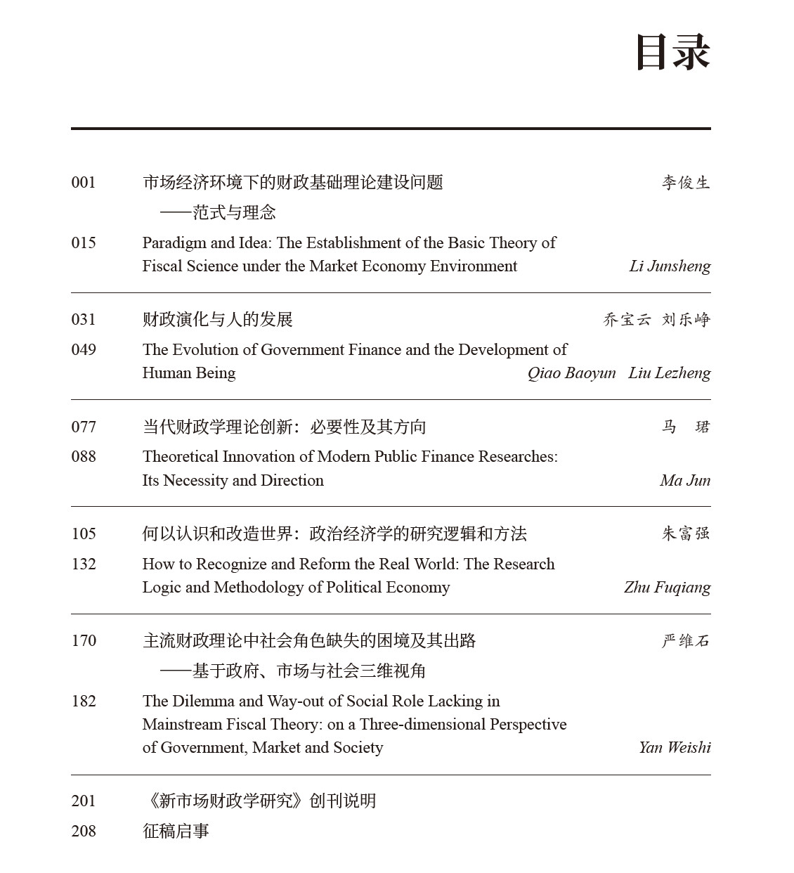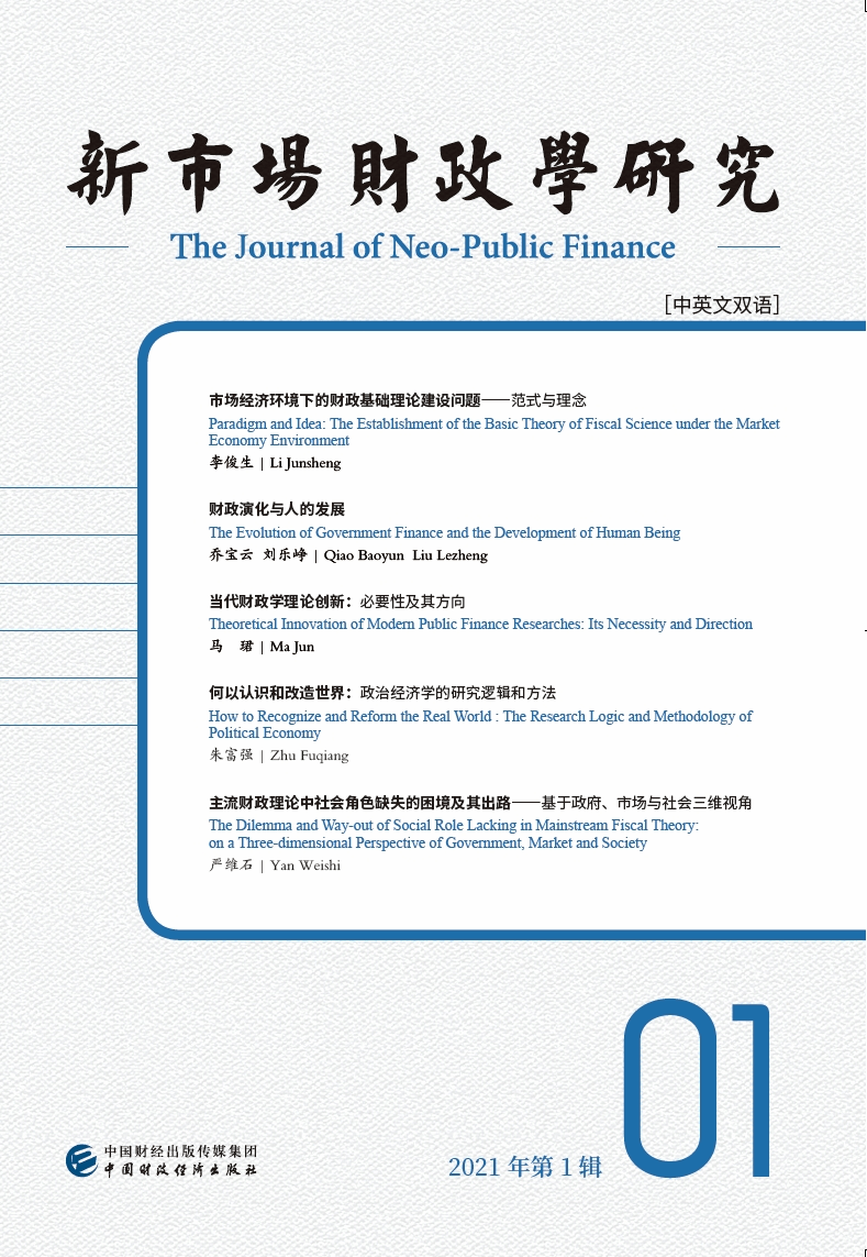 《新市场财政学研究》【中英文双语】集刊首辑共收录5篇文章,开篇由李俊生教授以《市场经济环境下的财政基础理论建设问题——范式与理念》一文为集刊创刊发表主编寄语。该文在辨析财政学学科属性问题,介绍新市场财政学学科定位的基础上,系统阐述了《新市场财政学研究》【中英文双语】的办刊宗旨。当前经济学范式对财政学研究范式的“垄断”导致了财政理论缺乏足够解释力和预测力。在此背景下,“新市场财政学”作为一个新的财政理论框架、新的财政科学分析与研究范式而提出,一方面为财政学基础理论的研究开辟了全新的研究视角,另一方面从国家治理需求的角度出发,为人类社会科学探索本地区和世界性的财政问题提供一套科学系统的财政理论体系与分析工具。该文从学说史的角度论证了财政学与政治经济学之间的关系,强调指出了“新市场财政学”与“公共财政论”(即“旧市场财政学”)之间的联系与区别,并从“经济体制”和“价值观”两个维度解释市场经济作为财政学科时代背景的意义。李俊生教授在文章结尾处向读者和撰稿者提出三点建议,倡导财政学术界同仁以《新市场财政学研究》【中英文双语】为财政基础理论的学术交流平台,共同推进财政科学理论体系的建设与完善。