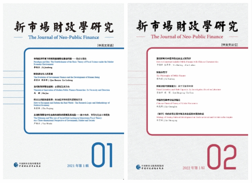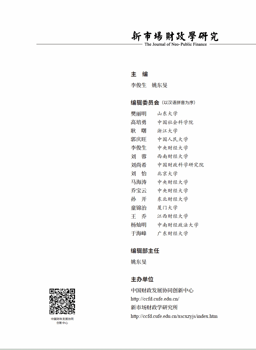 近日,《新市场财政学研究》【中英文双语】(The Journal of Neo-public Finance)2023年第1辑(总第3辑),由中国财政经济出版社出版发行。该刊首辑于2021年发行,主要刊发财政基础理论最新研究成果,是中央财经大学首本中英文对照的财政学基础理论类刊物。《新市场财政学研究》【中英文双语】由中央财经大学中国财政发展协同创新中心和新市场财政学研究所主办,中心首席专家李俊生教授和中心姚东旻教授共同担任主编,15位财政学界的知名专家学者组成编辑委员会。本辑共收录5篇文章,文章作者来自于中央财经大学、对外经济贸易大学、首都经济贸易大学、浙江财经大学、华东理工大学、浙江大学共6家单位。