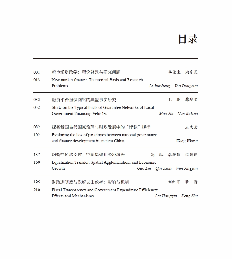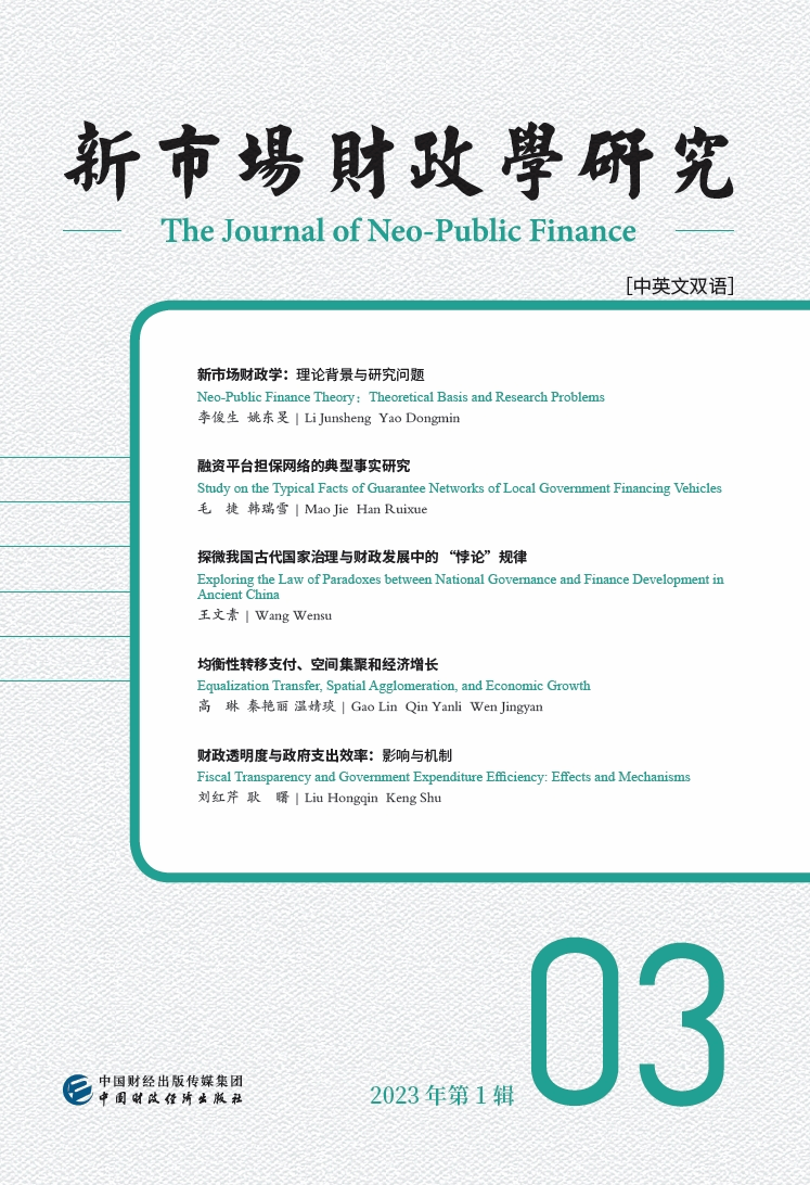 毛捷、韩瑞雪撰写的《融资平台担保网络的典型事实研究》基于手工搜集的2009-2019年融资平台担保数据,本文对融资平台担保网络的定义、度量和特征事实进行了系统分析。研究发现,凭借优越的资源优势,省级融资平台通常以对外担保为主,且担保金额较大,而层级较低的融资平台以接受担保为主、担保规模小,且通过与多家融资平台建立担保关系来分散风险;担保网络具有信用筛选作用,高信用评级的融资平台更容易在担保网络中获得资源;担保网络具有明显的地域集聚性、无标度特性和小世界现象;2009-2019年,担保网络的整体演变趋势为网络结构更复杂、更连通、更同配。王文素撰写的《探微我国古代国家治理与财政发展中的“悖论”规律》指出从人类为满足社会成员的共同需要考察,我国财政产生的时间早于夏王朝。虽然各朝代的大多数当权者为使财政回归“公共性”做出努力,但不能解决“少数人”决定“多数人”权利这个始终存在的根本问题,只能使财政发展线悖离公共线的幅度缩小,而长久不可能重合。高琳、钦艳丽、温婧琰撰写的《均衡性转移支付、空间集聚和经济增长》发现均衡性转移支付一方面通过大幅促进公共投资有力拉动了地区经济增长,另一方面又抑制了经济活动向高生产率城市集聚从而阻碍了地区经济增长,中国政府间转移支付政策理念应从过去的“帮地发展”升级为“帮人发展”。刘红芹、耿曙撰写的《财政透明度与政府支出效率:影响与机制》通过中国30个省份2009-2018年间的面板数据对象进行检验,实证结果发现如下:首先,地方政府加强财政透明度的建设的确有利于促进政府支出效率的提升。其次,在社会监督压力更大的地方,财政透明度对政府支出效率的改善效果将会增强。进一步的中介效应检验结果则表明,财政透明度主要是通过减少财政资金损失浪费、优化政府支出结构两种方式提升财政资金的使用效率。