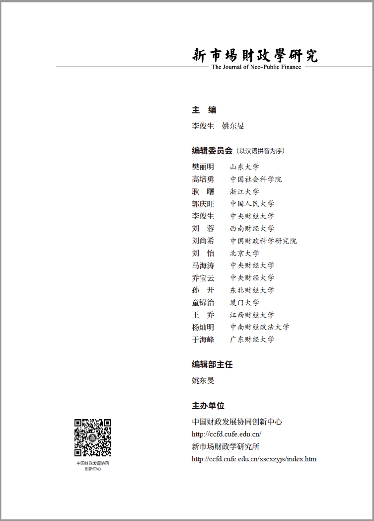 近日,《新市场财政学研究》【中英文双语】(The Journal of Neo-public Finance)2024年第1辑(总第4辑),由中国财政经济出版社出版发行。该刊首辑于2021年发行,主要刊发财政基础理论最新研究成果,是中央财经大学首本中英文对照的财政学基础理论类刊物。《新市场财政学研究》【中英文双语】由中央财经大学中国财政发展协同创新中心和新市场财政学研究所主办,中国财政发展协同创新中心首席专家李俊生教授和中国财政发展协同创新中心姚东旻教授共同担任主编,15位财政学界的知名专家学者组成编辑委员会。《新市场财政学研究》【中英文双语】集刊第四辑的发行标志着中央财经大学“双一流”建设重要成果——新市场财政学理论研究再上一个新台阶。该刊更加完整、系统地阐释了新市场财政学的理论框架,让社会各界更好地了解到了“新市场财政学”的使命与任务,从而推动孕育具有普适性和解释力的本土化财政学基础理论,产出世界一流的研究成果,最终实现我国财政学的理论自信。