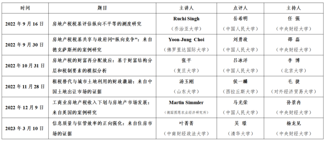 2022年秋季学期至2023年春季学期中央财经大学“房地产税制研究”系列共举办六场线上讲座。主讲专家分别来自乔治亚大学Terry商学院、佛罗里达国际大学Steven J. Green国际和公共事务学院、山东大学经济学院、复旦大学国际关系与公共事务学院、德国图恩农业经济研究所和中南财经政法大学财政税务学院。讲座内容涉及美国、英国和中国的土地和房地产税政策与实践。参与讲座点评与主持会议的专家分别来自美国西拉丘斯大学、北京大学、清华大学、中国人民大学、对外经贸大学和中央财经大学。