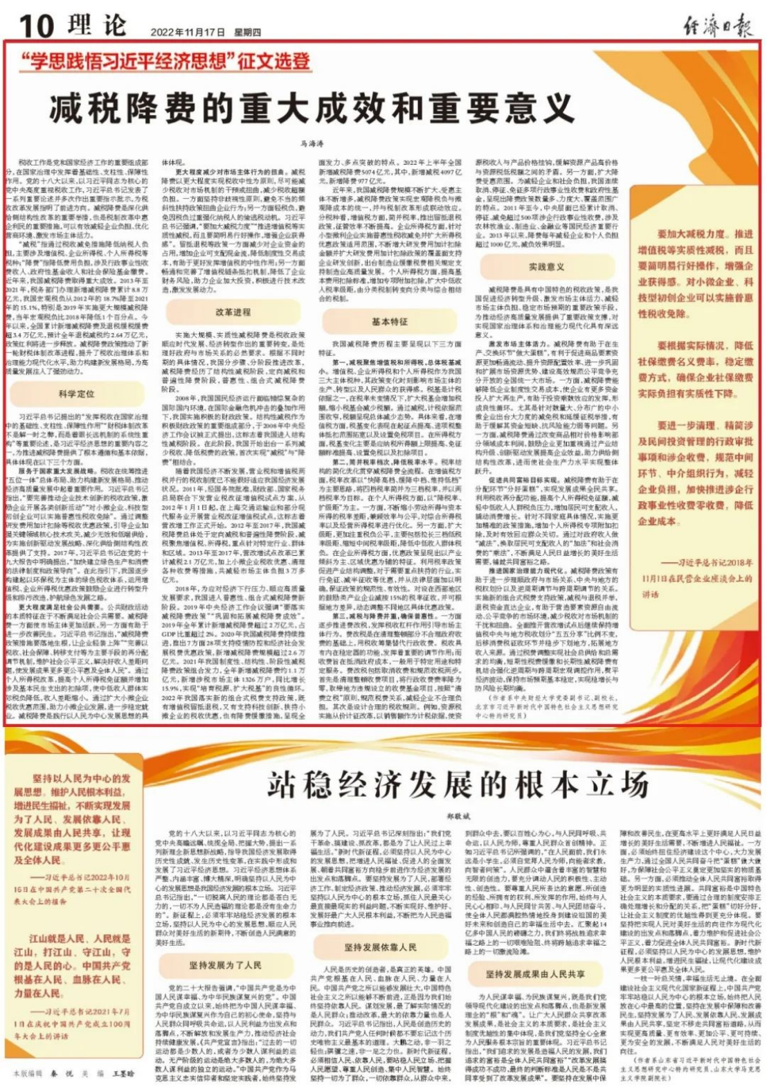 2022年11月17日,中央财经大学党委副书记、副校长马海涛教授就“减税降费的重大成效和重要意义”于《经济日报》刊文。文章指出习近平总书记关于财税体制的重要论述是我国减税降费的理论内涵,体现在服务国家重大发展战略、更大程度满足社会共同需要和更大程度减少对市场主体的行为扭曲三大方面。文中介绍我国减税降费发展进程经历“结构性减税阶段”(2008年至2011年)、“定向减税和普遍性降费阶段”(2012年至2017年)、“普惠性、组合式减税降费阶段”(2018年至2022年)三个重要阶段。基本特征体现在一是减税聚焦增值税和所得税,总体“税基”在减小,二是简并税率档次,降低税率水平,三是减税与降费并重,确保普惠性。最后文章指出减税降费是具有中国特色的税收政策,是我国促进经济转型升级、激发市场主体活力、减轻市场主体负担、稳定市场预期的重要政策手段,为推动经济高质量发展提供了重要政策支撑,对实现国家治理体系和治理能力现代化具有深远意义。全文如下:
