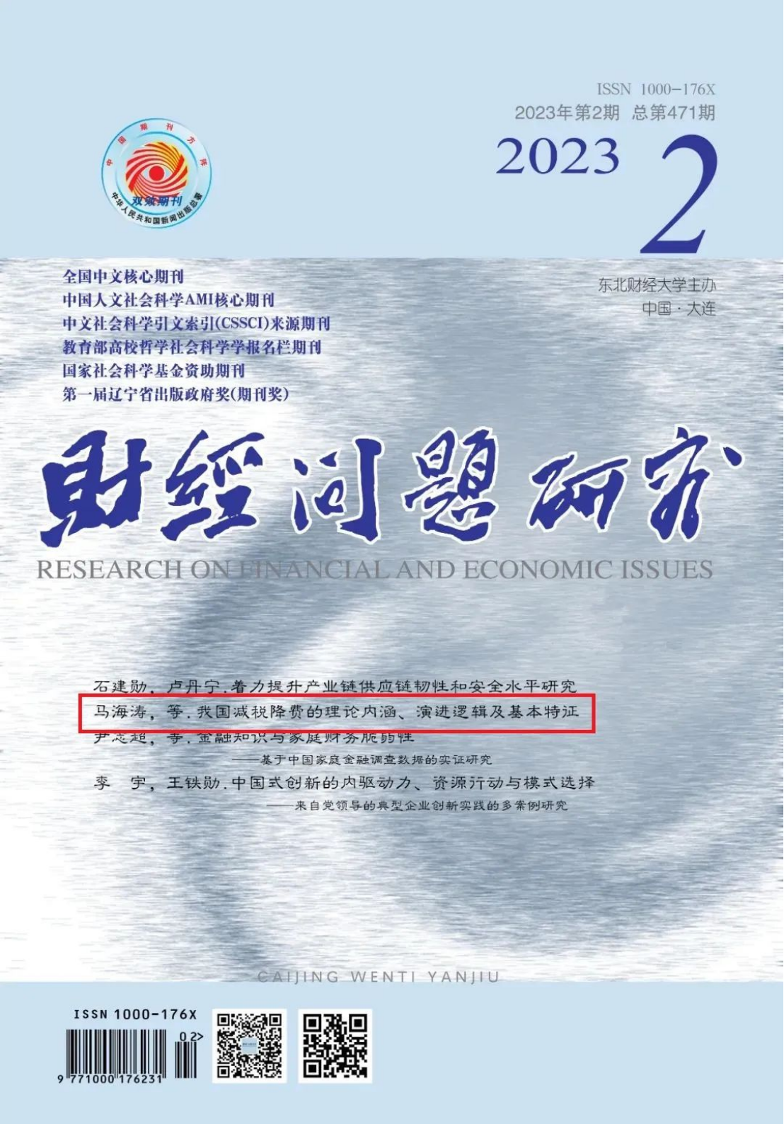 近日,中央财经大学党委副书记、副校长马海涛教授,中国财政发展协同创新中心教授、博士生导师姚东旻以及博士生孙榕(通讯作者)共同撰写的论文《我国减税降费的理论内涵、演进逻辑及基本特征》在《财经问题研究》2023年第2期理论研究(教育部名栏)作为封面文章刊发。