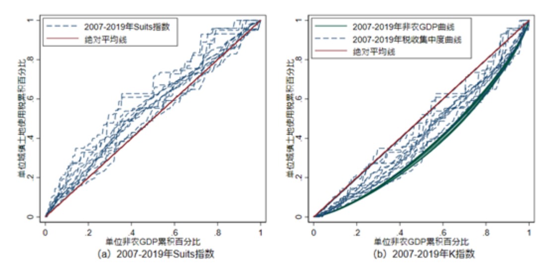 各地城镇土地使用税的纳税等级和单位税额标准皆不同,难以直接使用单位税额进行跨地区分析。因此将问题转化并基于回归和不平等指数的测度方法,探寻城镇土地使用税的实际税负与地方经济发展的关系。本文构造了衡量某区域城镇土地使用税实际税率的测度指标,即:该区域城镇土地使用税与该区域GDP的比值。并且以这一指标为被解释变量,以人均GDP为解释变量,基于面板数据进行回归分析,以验证地方经济增长与实际税率的相关关系。此外,本文还以城镇土地使用税的对数为被解释变量,以区域经济总量的对数为解释变量,计算该税种税收与经济发展的弹性系数,以验证城镇土地使用税增长是否与地方经济发展保持同步。除了回归的方法,本文将个人所得税累进(退)性的测度方法——Suits指数和Kakwani指数(简称K指数),引入城镇土地使用税的累进(退)性测度,基于截面数据验证跨地区城镇土地使用税税负,随经济发展水平变化而相应变化的情况。不平等指数测算结果主要以图形展示(图1)。左图Suits指数曲线在45°线以上为累退,右图K指数税收集中度曲线在非农GDP曲线上方为累退。图中显示测度结果整体为累退,意味着城镇土地使用税随地区经济发展水平上升而下降。