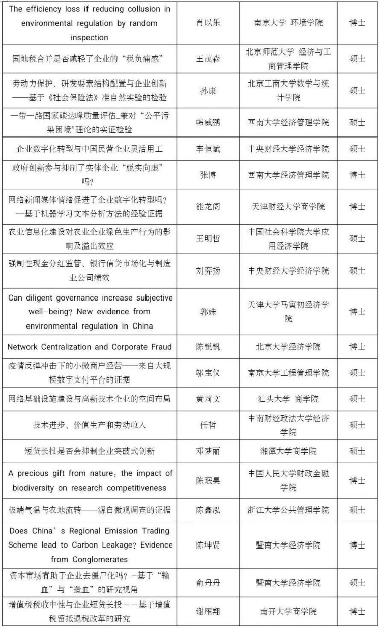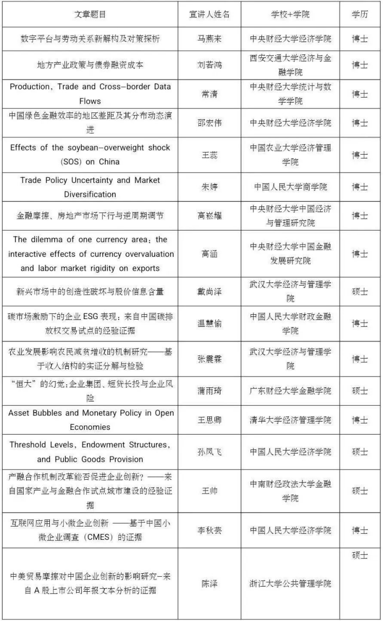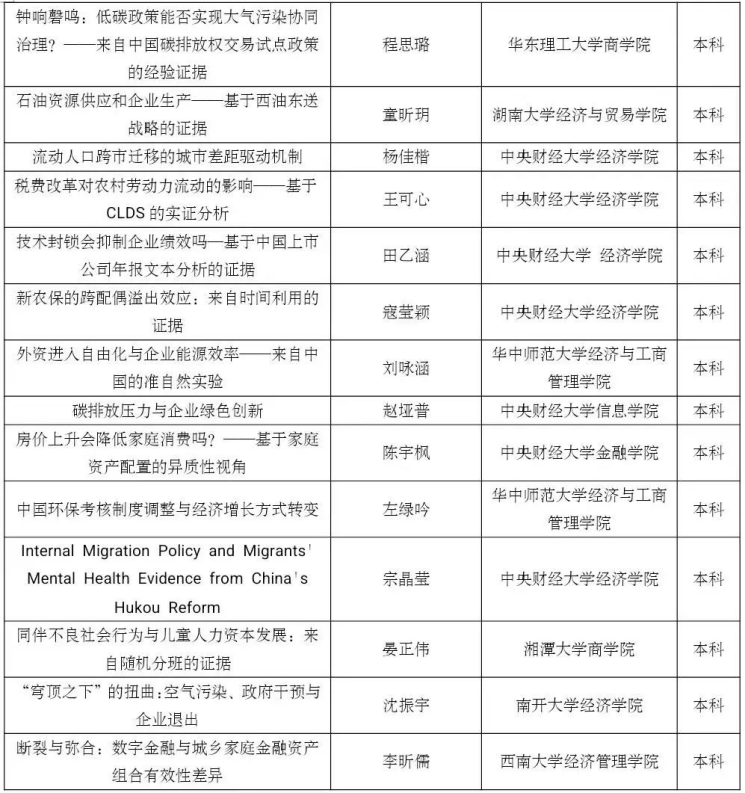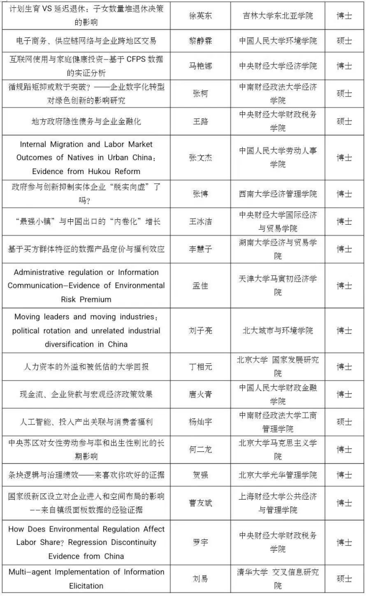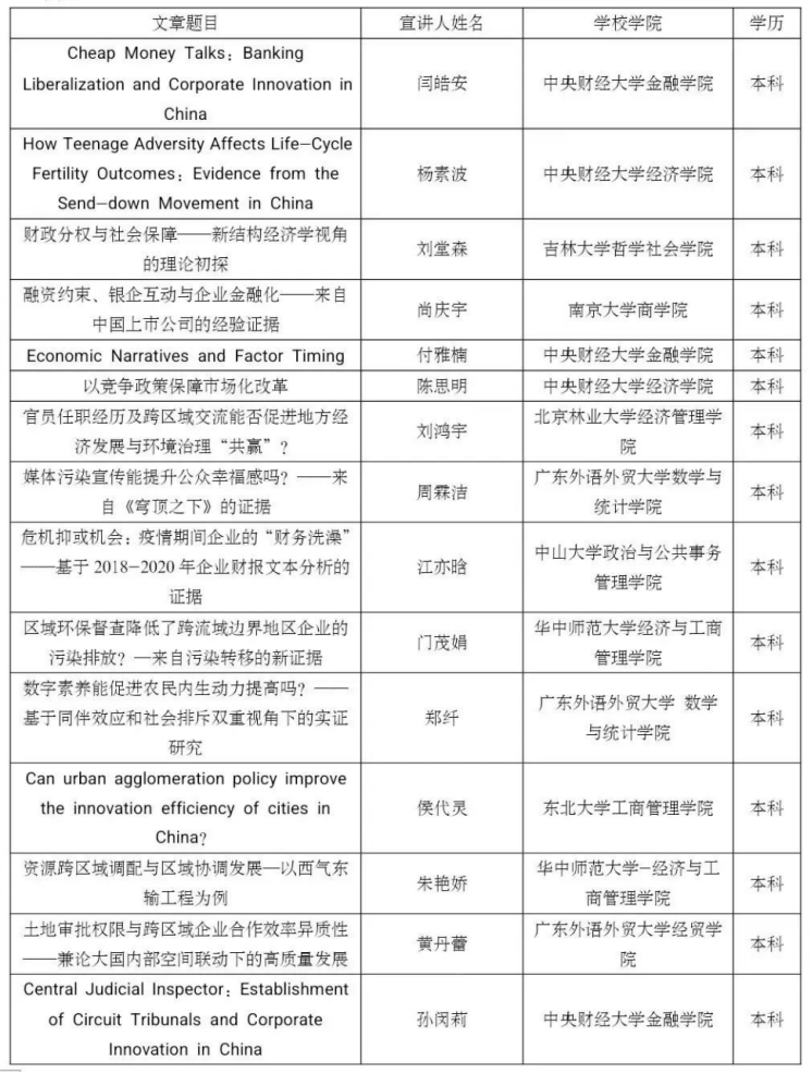 党的二十大报告指出,“教育、科技、人才是全面建设社会主义现代化国家的基础性、战略性支撑”。为了学习、贯彻和落实党的二十大关于教育和人才建设的精神,中央财经大学经济学院联合中国经济学年会、中国青年经济学家联谊会主办第五届未来经济学家论坛。本论坛坚持“公平、公正、公开”的原则,鼓励思想争鸣、学术创新,旨在为未来有志于从事经济学研究的全国高校在校学生(本科生和研究生)提供一个观点交流、思想碰撞的学术交流平台。本次论文征集环节共收到612篇投稿论文,经过评审论证和评审,最终遴选出126篇入围会议,名单如下,恭喜各位入选的同学: