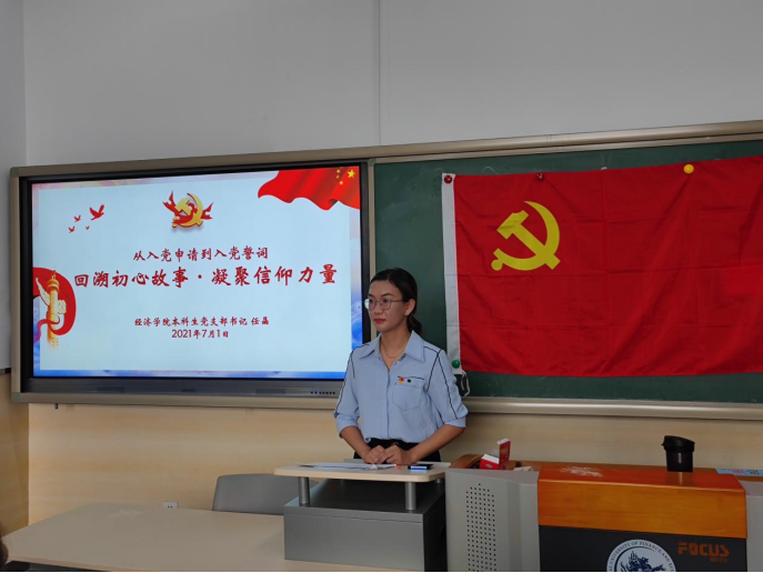 7月1日下午2:30,正逢党的百年华诞,经济学院本科生党支部在学院楼109教室举行了庄严的预备党员入党宣誓暨党史学习教育专题党课活动。经济学院本科生党支部书记任晶老师、2021年6月新发展的45名预备党员与部分正式党员共同参会。