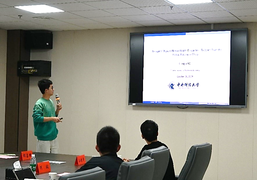 随后,中央财经大学经济学院基地班学生代表何成旭汇报了他的工作论文。文章探讨了中国户籍制度改革对移民健康的影响,以及如何应对流动人口与本地居民之间的健康不平等。随着移民规模的扩大,户籍制度改革对移民的生活产生了深远影响。然而,改革带来的健康效益并不确定,文章的研究重点在于移民是否更容易落户以及其可能面临的职业风险。这篇文章为理解中国户籍改革带来的非经济影响提供了重要视角,尤其是在改善流动人口健康和促进社会公平方面。