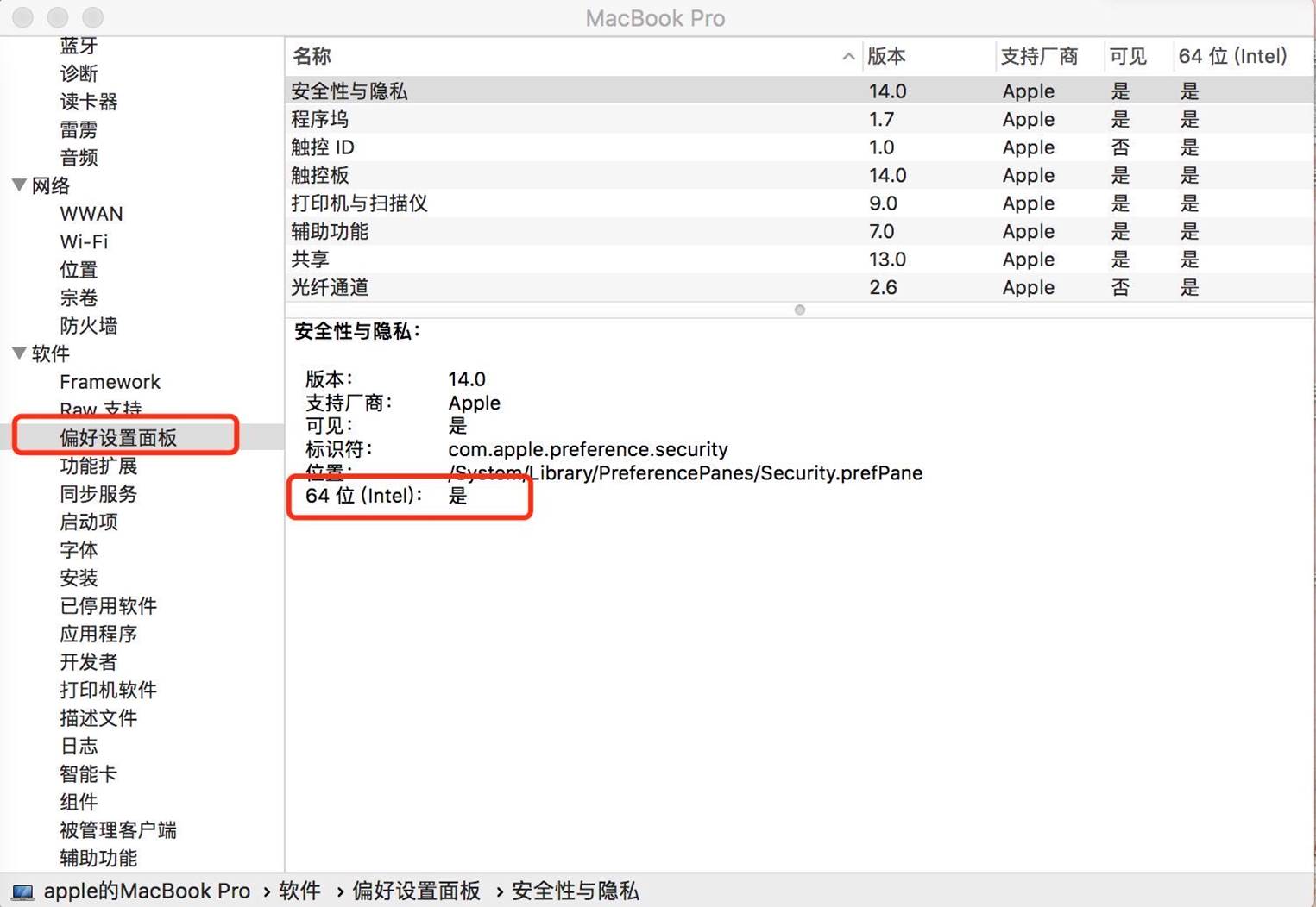 3.2点击显示系统版本窗口(上方示例)下的系统报告,左侧选项栏向下拉,找到偏好设置面版,可查看系统位数。
