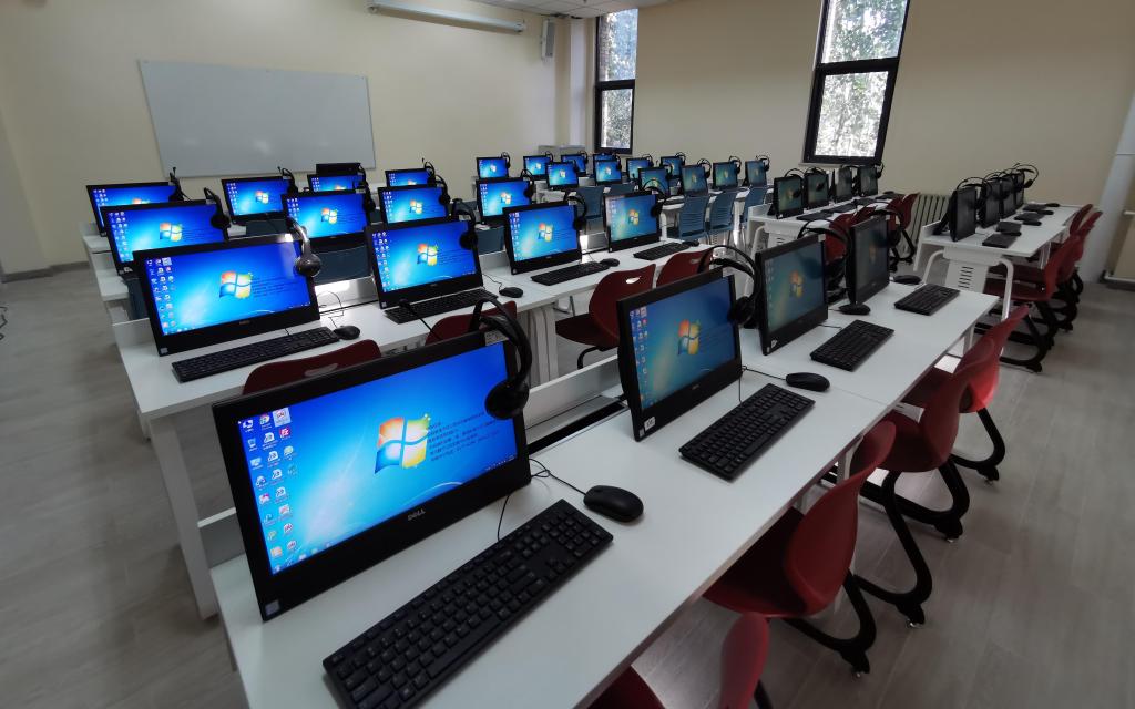 该实验室位于沙河校区学院楼2号楼2层,面积63㎡。实验室配备教师机1台、学生机36台、耳机、高清投影仪、功放等设备。同时已在讲桌预留投影、音频、网线接口,教师可以使用自带笔记本进行教学。实验室安装极域电子教室语音版,拥有语音广播、小组对话、对话录制等功能,适用于外语实验教学。