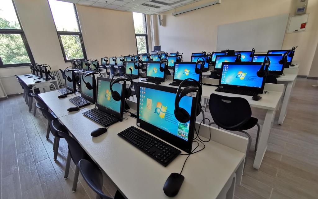 该实验室位于沙河校区学院楼2号楼2层,面积63㎡。实验室配备教师机1台、学生机36台、高清投影仪、功放等设备。同时已在讲桌预留投影、音频、网线接口,教师可以使用自带笔记本进行教学。实验室安装极域电子教室语音版,拥有语音广播、小组对话、对话录制等功能,适用于外语实验教学。