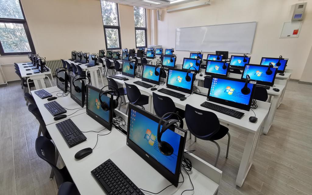该实验室位于沙河校区学院楼2号楼2层,面积63㎡。实验室配备教师机1台、学生机36台、耳机、高清投影仪、功放等设备。同时已在讲桌预留投影、音频、网线接口,教师可以使用自带笔记本进行教学。实验室安装极域电子教室语音版,拥有语音广播、小组对话、对话录制等功能,适用于外语实验教学。