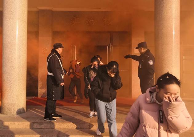 上午9时,消防警报在整个实验楼响起,实验室工作人员迅速引导上课的老师和学生俯首低姿、紧张有序地从临近楼梯快速集结到实验楼指定地点。与此同时保卫处及后勤集团安排消防处置人员也各自就位应对。在集结地点,各个班级清点好人数,随后大钟寺派出所李警官对这次演练进行了总结发言,总结此次演练的情况,指出演练基本达到了预期效果。
