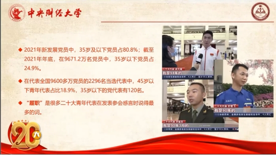 周琪讲师首先用数据直观展现了新时代青年紧紧凝聚在党的周围,响应党的号召主动投身于中国特色社会主义建设的伟大实践中,并以“济南英雄联连长孙金龙”、“两届冬奥会冠军武大靖”、“民间救援道路上的蓝色战士於若飞”等青年代表为例生动讲述了青年的奋斗实践故事。