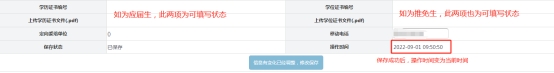 第二步:根据系统内栏目状态,填写并上传所需材料,证书文件电子版均需为PDF格式,大小不得超过1M。填写完毕点击下方按钮保存,保存成功后操作时间更改为当前时间。