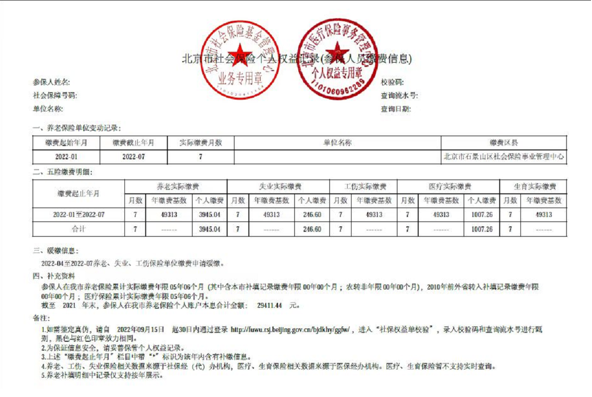 提供1-6月、2-7月、3-8月或4-9月的北京市社会保险个人权益记录(参保人员缴费信息)(不含补缴)(样例见5.1)。 如为央保,请提供加盖公章的制式《中央国家机关事业单位养老保险个人参保证明》等材料,仍需满足本年度连续缴纳6个月(含)以上要求。 |