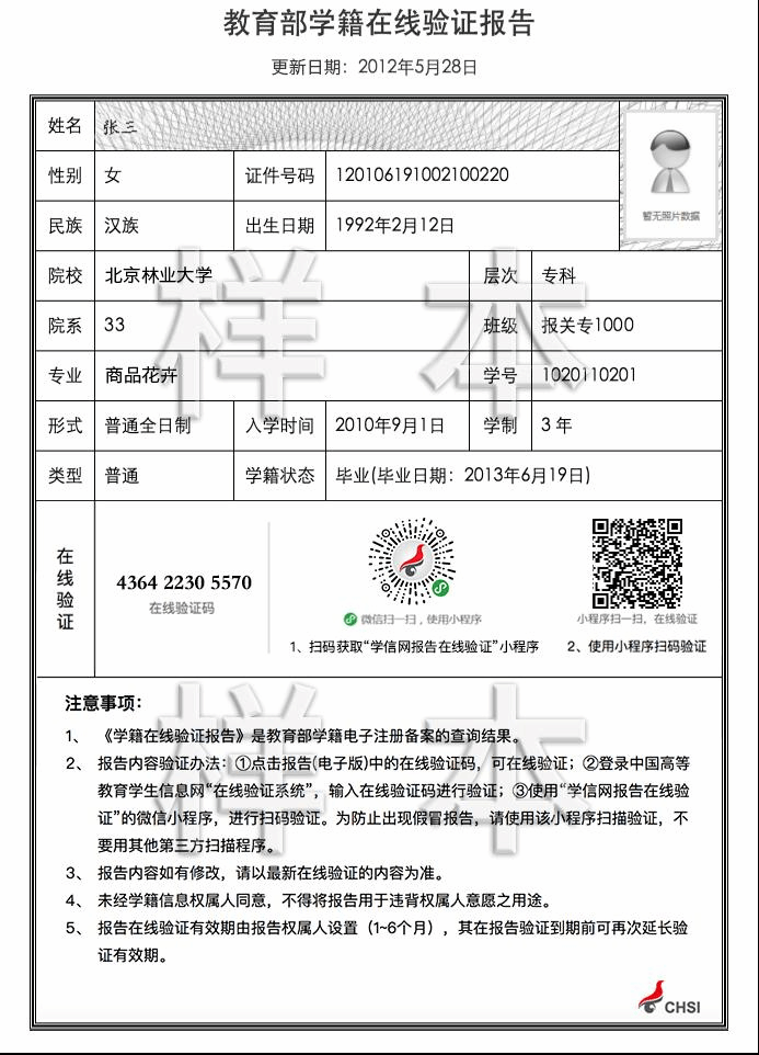 《教育部学籍在线验证报告》和《教育部学历证书电子注册备案表》样例: