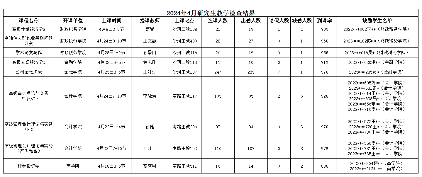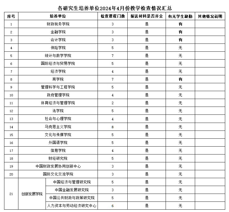 有4个培养单位存在学生缺勤情况,按照《中央财经大学研究生教学管理规定》(校发〔2017〕159号),为以上课程的缺勤同学各记录缺勤1次,相应课程期末考核总成绩扣减10分。