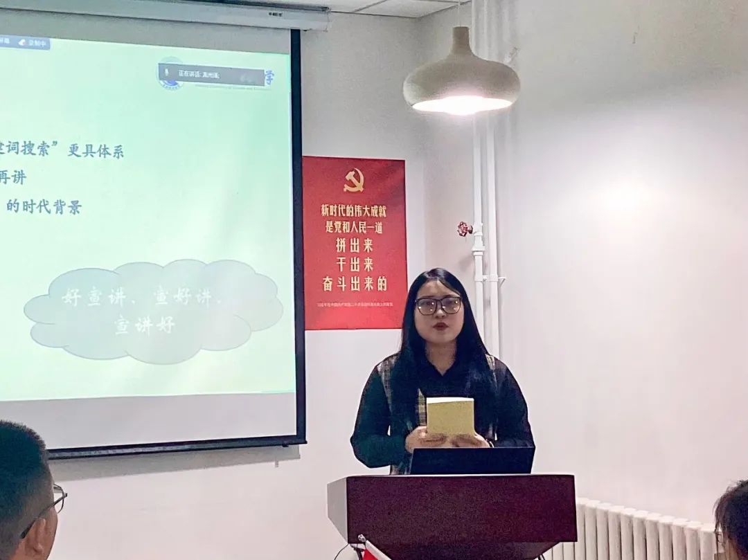 最后,研究生工作部思想教育办公室赵克法老师进行总结。赵老师首先感谢清华大学的两位讲师来校交流,进行示范宣讲和指导点评。非尽百家之美,不能成一人之奇,大家在一起进行集体备课,能够开阔宣讲思路,塑造青年共识。其次强调要把习近平新时代中国特色社会主义思想内化于心,研究透内涵要义、理清楚逻辑关系,不断将财经专业知识与党的新观点、新论断、新思想相结合。最后鼓励我校研究生宣讲团全体讲师积极备课,认真对待本学期主题教育校内外宣讲,在第三届宣讲团的这一年任期中有所收获,有所感悟。