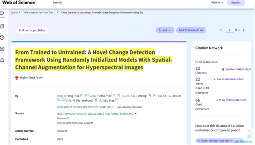 根据科睿唯安最新ESI数据,信息学院李静副教授作为唯一通讯作者,于2023年发表在IEEE TRANSACTIONS ON GEOSCIENCE AND REMOTE SENSING(TGRS)上的文章“From Trained to Untrained: A Novel Change Detection Framework Using Randomly Initialized Models With Spatial-Channel Augmentation for Hyperspectral Images”,截至目前,在Web of Science中共被引用22次,被评为ESI高被引论文。该论文主要借助深度学习算法解决基于高光谱图像的地物变化检测问题。