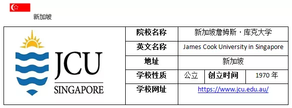 詹姆斯·库克大学(James Cook University)成立于1970年,是澳大利亚顶尖的国立研究型大学之一。其新加坡校区是第一间由澳洲政府大学在新加坡的直属校区,开设的课程与詹姆斯·库克大学主校区完全相同。