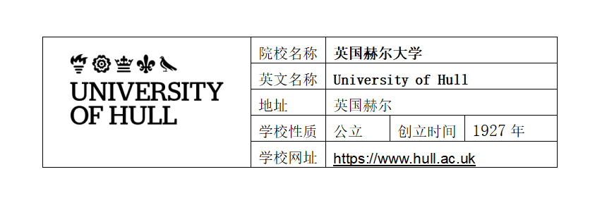 建校于1927年,赫尔大学是英格兰第14古老的大学。2018年的英国政府大学教学质量评比中获得了银奖。2014年被中国教育部留学服务中心评选为最佳海外大学,同时获得英国高等技术领域最高奖项‘女王技术成就奖’、‘国家历史性化学里程奖’等。赫尔大学是英国奥委会第一所大学合作伙伴,合作周期为6年,覆盖东京2020,巴黎2024以及北京2022。
