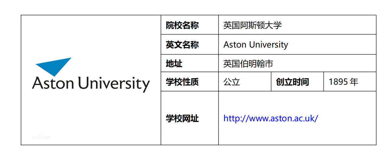 阿斯顿大学是英国一所以研究为主导的科技大学。以世界一流的教学质量以及与行业、政府和商业的紧密联系而著名。据泰晤士高等教育评选,阿斯顿大学“国际声誉”位列全球前10名;“最国际化”大学排名中位列全英第9名,全球第33名。在QS星级计划排行榜中,阿斯顿大学被评为“全球五星杰出大学”。在2016年泰晤士高等教育报教学质量排名中,阿斯顿大学荣获全英第2名。在2017年QS世界大学就业能力排名中,阿斯顿大学名列全球第18名。