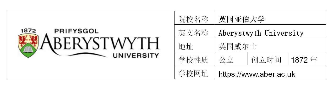 英国亚伯大学始建于1872年,最初名为威尔士大学学院,是威尔士地区成立的第一所正规大学。重视知识与学术的亚伯大学是威尔士的重要高等学府,也是英国重要的研究型大学,且在全世界享有盛誉。亚伯大学拥有全英最大,且全世界第一所建立的国际关系学院,和威尔士第一所法学院。凯尔特研究系,国际关系系全英第一。
