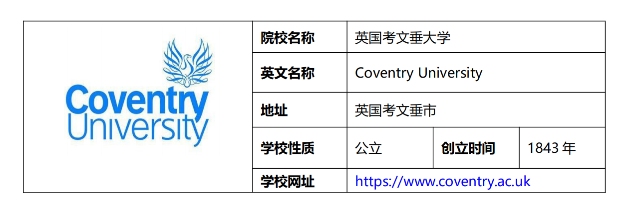 考文垂大学的建校历史可追溯到1843年考文垂设计学院,是英国卫报2020大学综合排名第15的顶尖大学。2017年在英国最新《卓越教学纲要(TEF)》评估中,考文垂大学荣获该评级最高荣誉金奖(TEF是评估教学质量的重要指标之一),同时在泰晤士报的学生体验和教学质量满意度的调查中该校排名前四,是一所能够提供高质量的学术教育、继承多学科研究优良传统的著名高校。