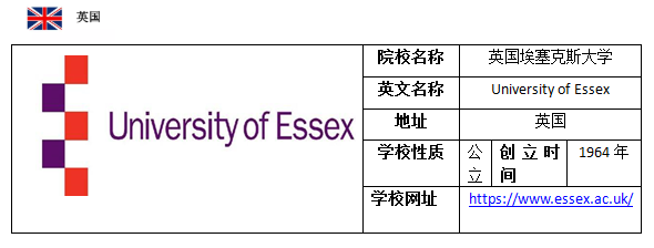 埃塞克斯大学(University of Essex)于1964年建校,是英国英格兰的一所世界顶尖公立研究型大学。作为全英教学质量和科研实力“双一流”的大学,和全英教学卓越框架优秀金奖获得者(TEF 2017),埃塞克斯大学综合科研质量全英排前25 (TGUG 2020),社会科学学科稳居全球第48位、全英第4位。