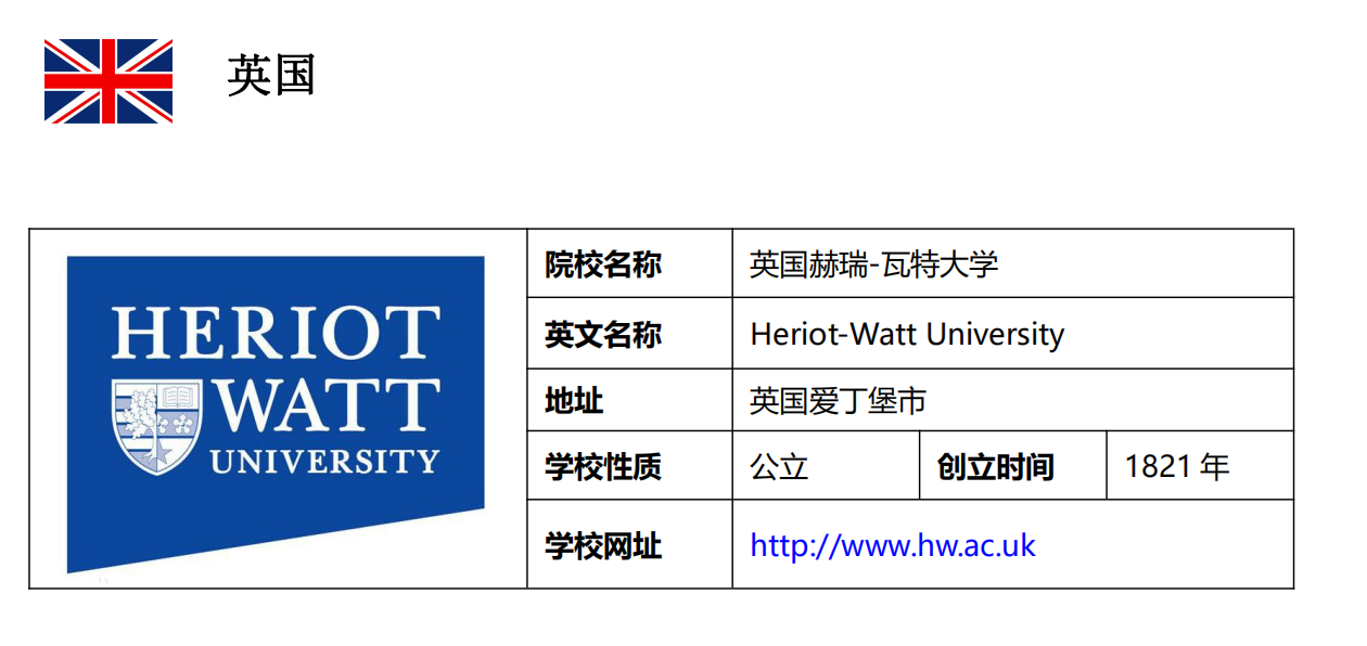 赫瑞-瓦特大学(Heriot-Watt University)是具有190多年历史的英国大学,也是英国历史上建立的第八所高等学校,是一所理工科学和经济人文科学并重的综合性大学。在英国最权威的“卓越研究框架”(REF)的评估中,综合排名全英第33位,82%以上的科研项目被评为世界水平。