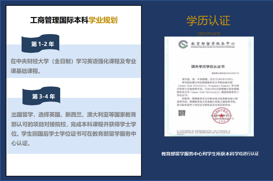 学生在中央财经大学学习两年,这一阶段开设的主要课程有英语强化培训课程及专业课通识课程,所有课程与国外大学直接对接,可豁免国外对接大学本科课程的部分学分,从而缩短在国外的学习时间,大大降低留学成本。学生完成国内阶段培训课程并达到雅思要求后,直接申请进入国外对接院校继续深造,完成国外阶段规定学业课程,获得对接院校大学本科学位,回国后其学历由中国(教育部)留学服务中心予以认证。