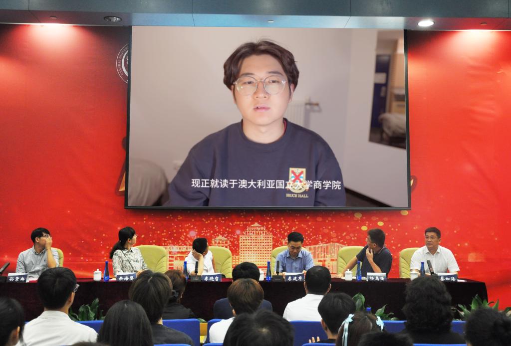 此外,2021级优秀学生代表赵新望在澳大利亚国立大学以远程视频的方式分享了他在中央财经大学两年的学习生活经历,并表示学校老师们给予的鼓励与支持是他勇敢前行的勇气和底气,是支持他从中财大到澳国立、从北京到堪培拉的精神力量。他祝福学弟学妹们都能勇敢地扛起属于自己的责任,奔向属于自己的梦想。2022级工商管理国际本科专项班倪享代表老生在发言中分享了自己在校一年的学习和实践经历,并引用中财大校训勉励新生们践行龙马精神,用坚实的脚步为青春画下生动的注脚,在奋斗中享受丰富多彩的大学生活。