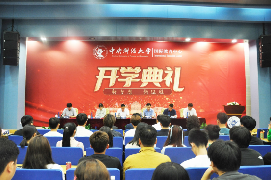 在庄严的国歌中,开学典礼拉开了帷幕。首先,李晓哲在致辞中向各位新同学表示祝贺。对中央财经大学凭借雄厚的办学力量、鲜明的国际化办学特色、强大的师资团队在持续探索高质量国际化人才培养道路上取得的成绩表示肯定。他指出,全球治理体系深度变革,全面建设社会主义现代化国家、全面推进中华民族伟大复兴需要强有力的人才和智力支持,培养和造就国际化人才最直接有效的途径是接受高质量国际化教育。他希望同学们能够脚踏实地、刻苦努力,成为创新人才;胸怀国之大者,在新时代担当新使命,在新征程展现新作为;传承好中华文化,讲好中国故事,为建设人类命运共同体贡献力量。他还介绍了中国留学服务中心和出国留学培训项目,并表示未来留学服务中心将继续和中央财经大学一起围绕同学们的实际需求为大家提供坚实的学习保障和服务。