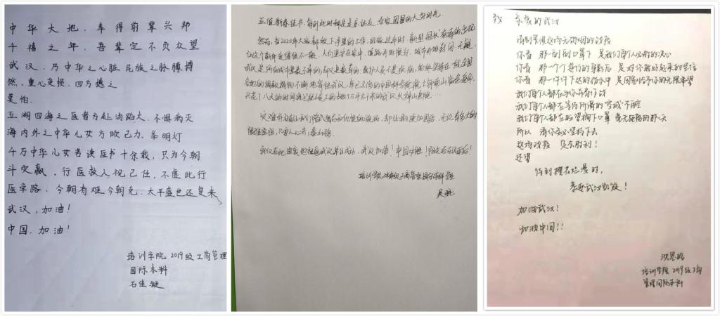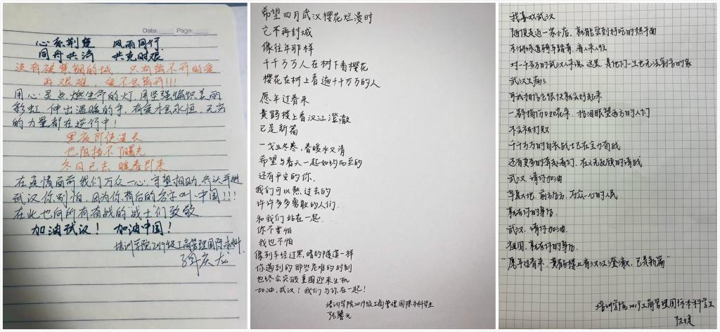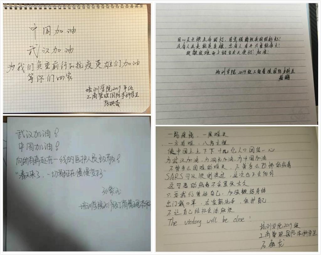 在此战“疫”期间,培训学院2019级工商管理国际本科的学生积极响应,以书法、诗歌等多种形式表达了自己对武汉及湖北疫区人民的支持,表达了自己抗击疫情的信心。相信我们一定可以众志成城,共克时艰!