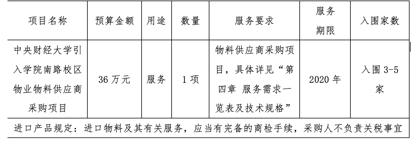 中央财经大学引入学院南路校区物业物料供应商采购项目采购项目的潜在供应商应在 网上 获取采购文件,并于2020年4月24日10点00分(北京时间)前提交响应文件。