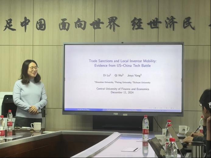 2024年12月11日下午,中央财经大学庆祝建校75周年系列学术讲座第137期在沙河校区学院11号楼308会议室顺利举行。北京大学光华管理学院应用经济学系助理教授吴祁应邀为师生主讲“Trade Sanctions and Local Inventor Mobility: Evidence from US-China Tech Battle”专题讲座。讲座由经济学院院长郭冬梅教授主持,多位教师及40余名学生参加。