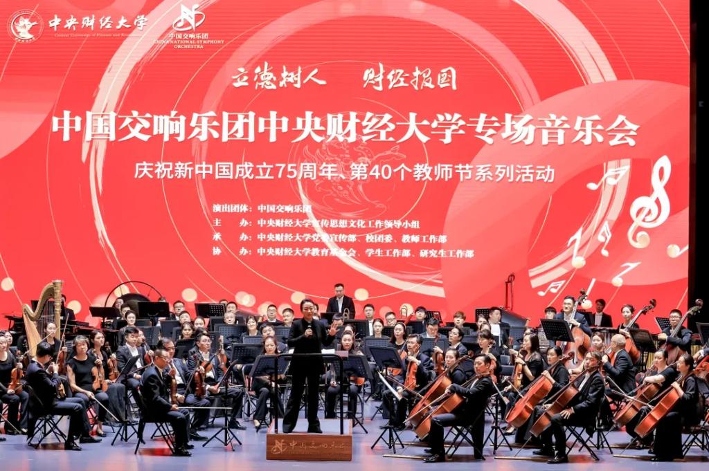 为庆祝第40个教师节,喜迎新中国成立75周年、建校75周年,9月9日晚,学校在沙河校区千人讲堂隆重举办“立德树人 财经报国”中国交响乐团中央财经大学专场音乐会。中国交响乐团党委书记周宇、演出营销中心主任罗琪,学校党委书记吴国生,校长马海涛,校党委副书记、纪委书记张庆东,校党委常委、副校长李建军,校党委常委、宣传部部长雷洪峰以及师生校友等1000余人观看了音乐会。