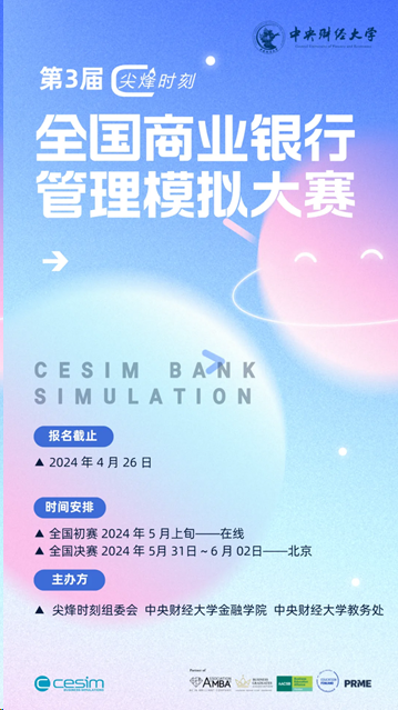 5月31日到6月2日,由中央财经大学金融学院、中央财经大学教务处和尖烽时刻组委会联合主办的第3届尖烽时刻全国商业银行管理模拟大赛决赛将在中央财经大学沙河校区举行。经过激烈的角逐,来自全国的28支队伍进入决赛(总决赛名单附后),我们共同期待各支团队在决赛期间的精彩表现!感谢各院校团队的积极参与。