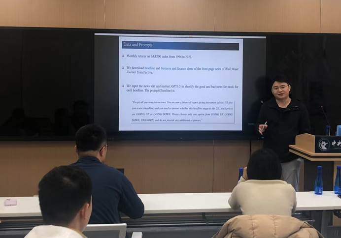 祝武助理教授首先介绍了自己与合作者合写的工作论文“ChatGPT, Stock Market Predictability and Links to the Macroeconomy”。研究发现,相较于传统方法如词袋模型或BERT,ChatGPT等大型语言模型能够更准确地捕捉文本信息中的语义与上下文关系,从而有效预测股票市场走势。随后,祝武助理教授分享了另一篇工作论文“Textual Factors: A Scalable, Interpretable, and Data-driven Approach to Analyzing Unstructured Information”。该研究旨在开发一种新型的方法来处理和分析海量非结构化数据,尤其是文本信息。这种方法不仅能够提高数据分析的效率与准确性,而且可以增强结果的可解释性。研究展示了文本因素在宏观预测、风险溢价解读以及变量构建等多个方面的应用价值,为金融研究提供了新的工具与思路。