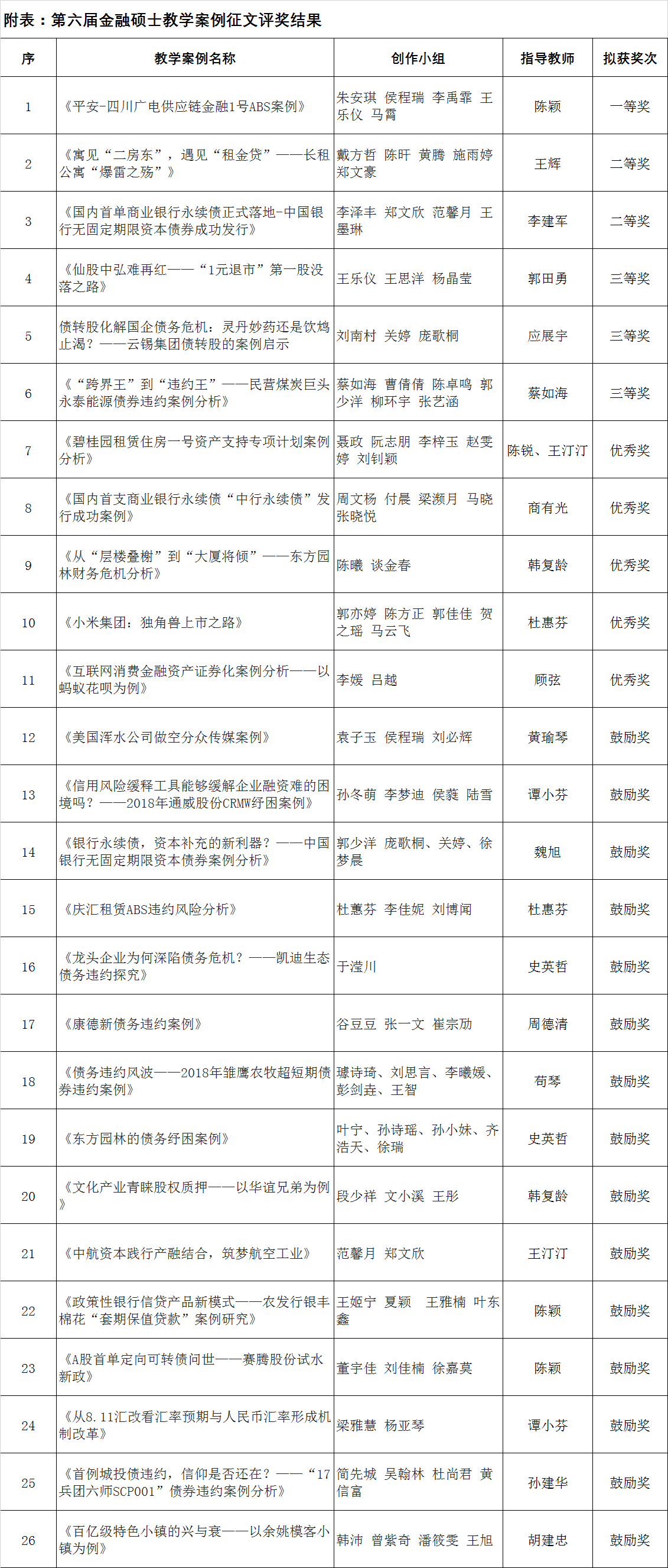我院第六届金融硕士教学案例征文评奖活动自2018年12月6日启动以来,共收到案例作品27篇。经不端检测、匿名评阅、答辩评审等环节严格把关,最终评出一等奖1名,二等奖2名,三等奖3名,优秀奖5名,鼓励奖15名,其中优秀及以上奖次都进行了答辩评奖环节。现将评奖结果公布给大家(见附表)。如有异议,请在5月20日下午16点前与学院研究生工作办公室联系,电话62289313。