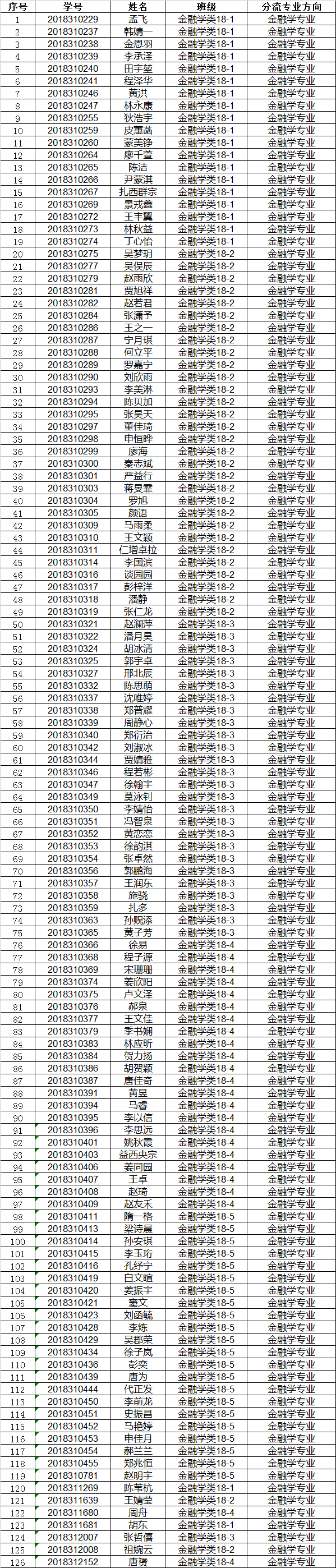 根据金融学院2018级金融学类本科生专业分流方案,学院组织开展了2018级金融学类本科生专业分流工作。现将专业分流结果公示如下: