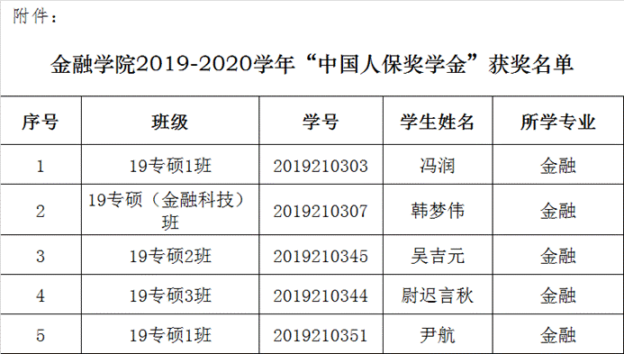根据《中央财经大学金融学院“中国人保奖学金”评奖办法》和《关于开展金融学院2019-2020学年“中国人保奖学金”评审工作的通知》等文件规定,经学生本人申请,学院人保奖学金评审小组审核、评审,评选出冯润等5名硕士研究生获人保奖学金。现将拟获奖学生名单(见附件)向全院公示。公示期三天,时间为12月4日至12月6日。对以上名单持有异议者,请在公示期内向学院人保奖学金评审小组提出申诉,具体与学生工作办公室(学院南路校区:62288609;沙河校区:61776421)联系。
