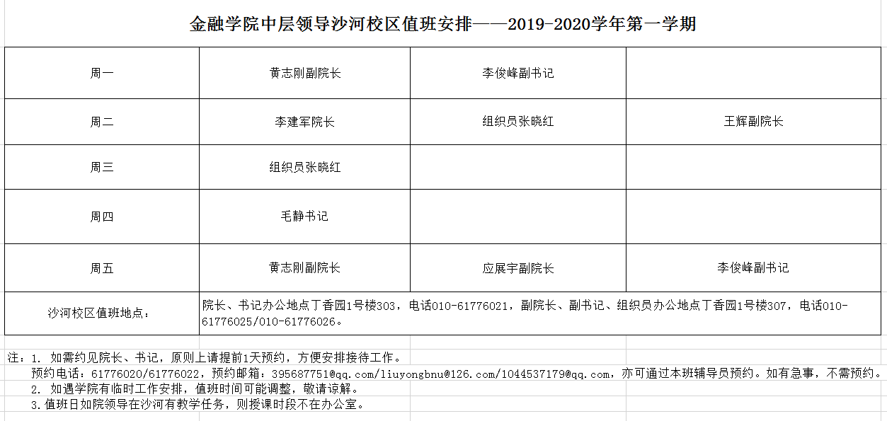 金融学院中层领导沙河校区值班安排——2019-2020学年第一学期