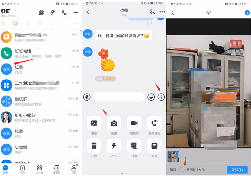,接着点“拍摄”,对“手写的答卷”进行拍摄(确保拍摄图片清楚,答题笔迹清晰可辨认),拍摄后点选“原图”,然后将拍摄图片发送给考务老师。考务老师接收图片后,检查所拍摄答卷图片,并跟考生确认交卷完成。考生操作主要步骤如下图所示: